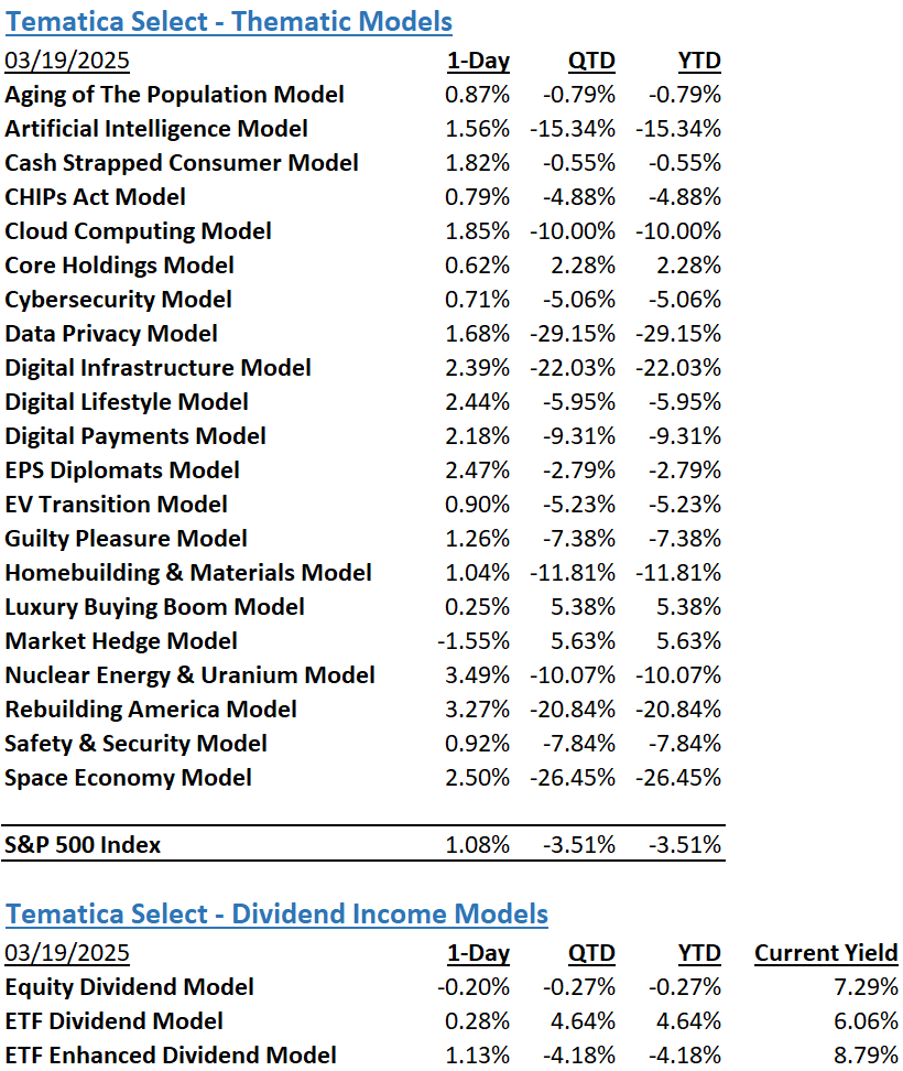 The Tematica Select Model Suite had a strong day across the board except for Luxury Buying Boom which saw some weakness as traders stepped in to “sell the news” after at least one luxury goods provider posted healthy results and an increased dividend. Otherwise, leadership came from Nuclear Energy & Uranium and Rebuilding America, followed by Space Economy and EPS Diplomats.