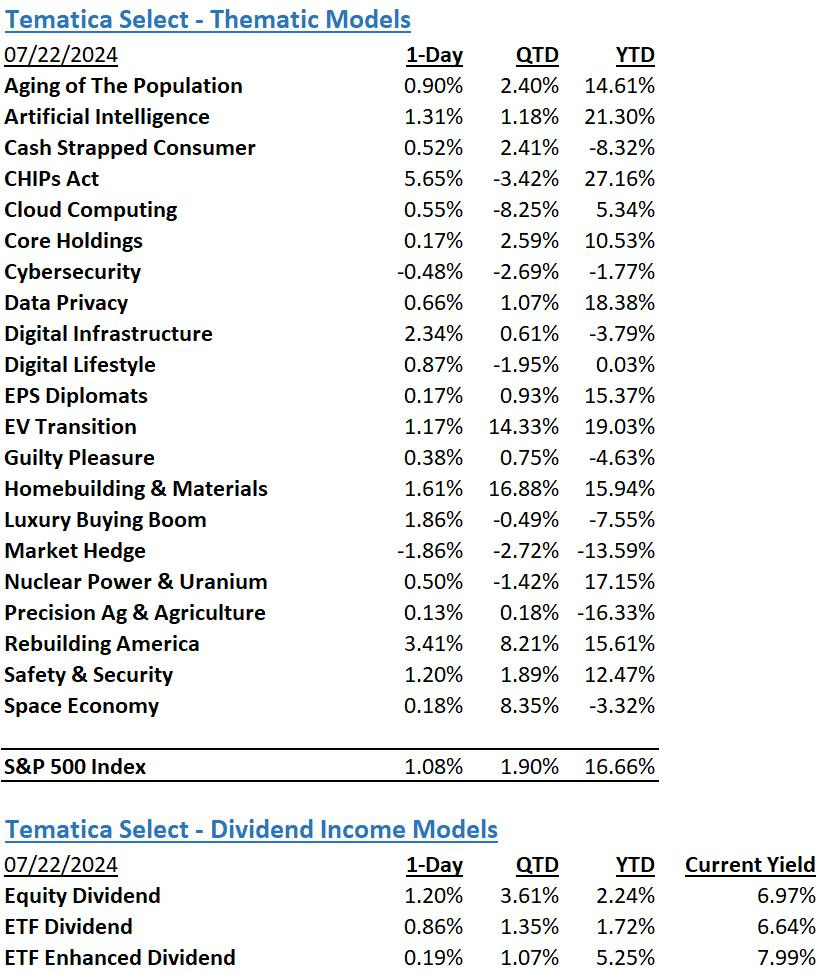 The read through on Polaris’s comments are consumer demand for its products is tepid at best, more likely weak. Because ATVs and related recreational vehicles are primarily discretionary items, it’s fair to say these results support a more cautious and selective consumer. We see that benefitting our Cash Strapped Consumer strategy. Meanwhile, Quest Diagnostics (DGX), delivered a beat and raise June quarter, due in part to greater testing demand tied to our Aging of the Population strategy. Quest tossed out its efforts in automation and AI in its press release, potentially providing AI use cases the market is increasingly looking for.
