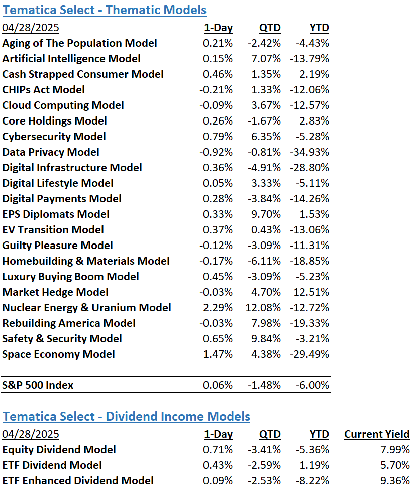 The Tematica Select Model Suite saw mixed results, with 5 strategies ending the day essentially flat. Leadership came from Nuclear Energy & Uranium and Space Economy, and laggards included the CHIPs Act and Data Privacy.